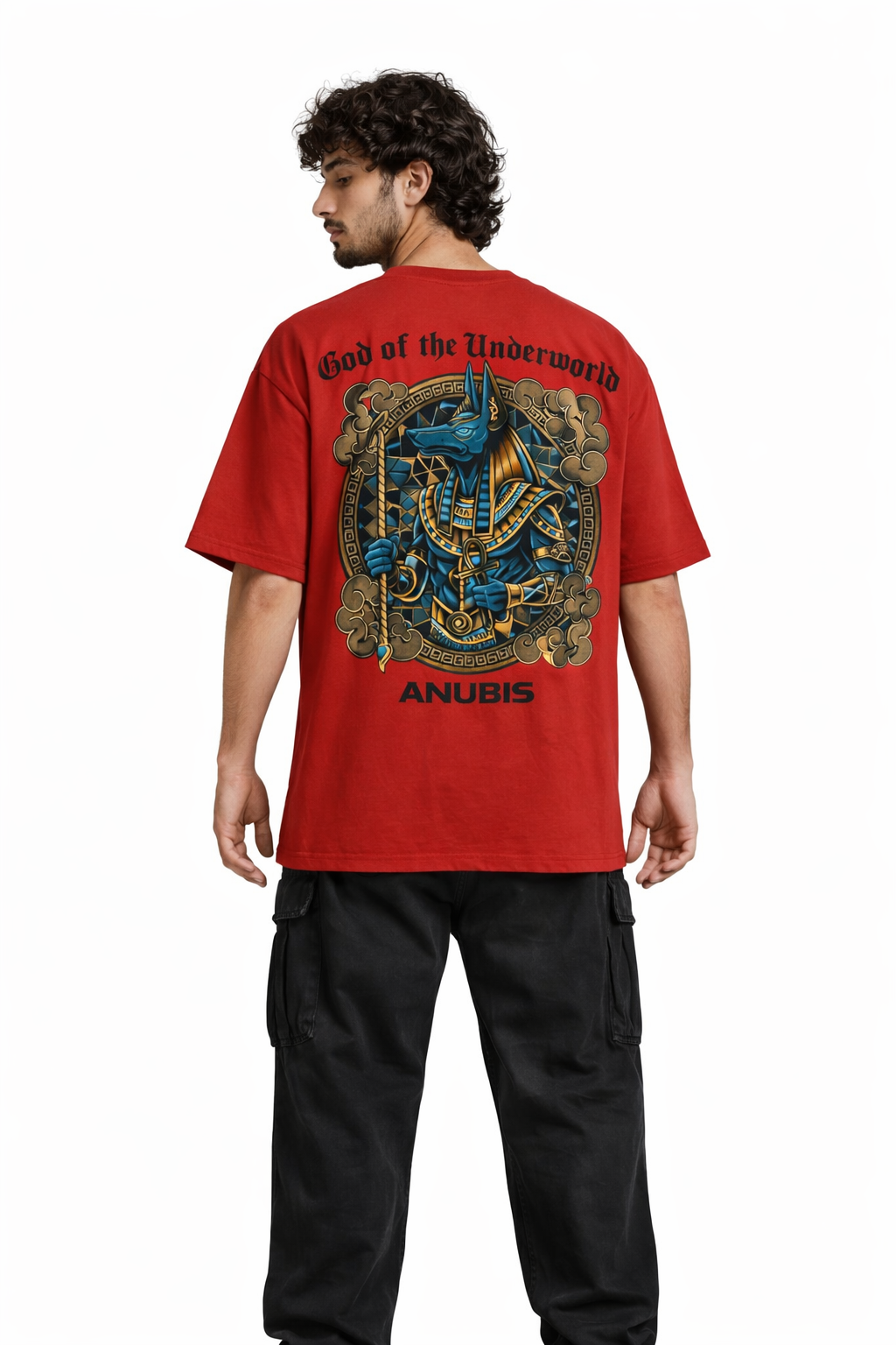 The front features a gold Anubis head emblem, symbolizing strength and protection, while the back showcases a bold, detailed Anubis artwork with “God of the Underworld” typography. A subtle Eye of Horus print on the sleeve completes the look, adding depth and meaning from every angle.